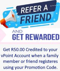 When someone registers using your promotion code, you will be will be credited by 1 vPoint which is equivalent to R50.00. vPoints are points that a client earns when their promotion code is used when a new client is registering with us. These points can then be claimed and redeemed via your profile. Terms and conditions apply.